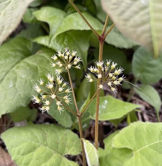 On the way back to the trailhead, I see one of my current favorites, Wild Sarsaparilla, Aralia nudicaulis, thriving along the path. There’s nothing dramatic about this plant. I see peace and serenity. The three space-age chandelier clusters chill under their leaf canopy. The zen-like leaves and flowers emit a harmonious energy. The stems have no leaves except for the big ones shading the flowers. I’d like to curl up next to one of the clusters, reading a book and drinking a root beer slush.