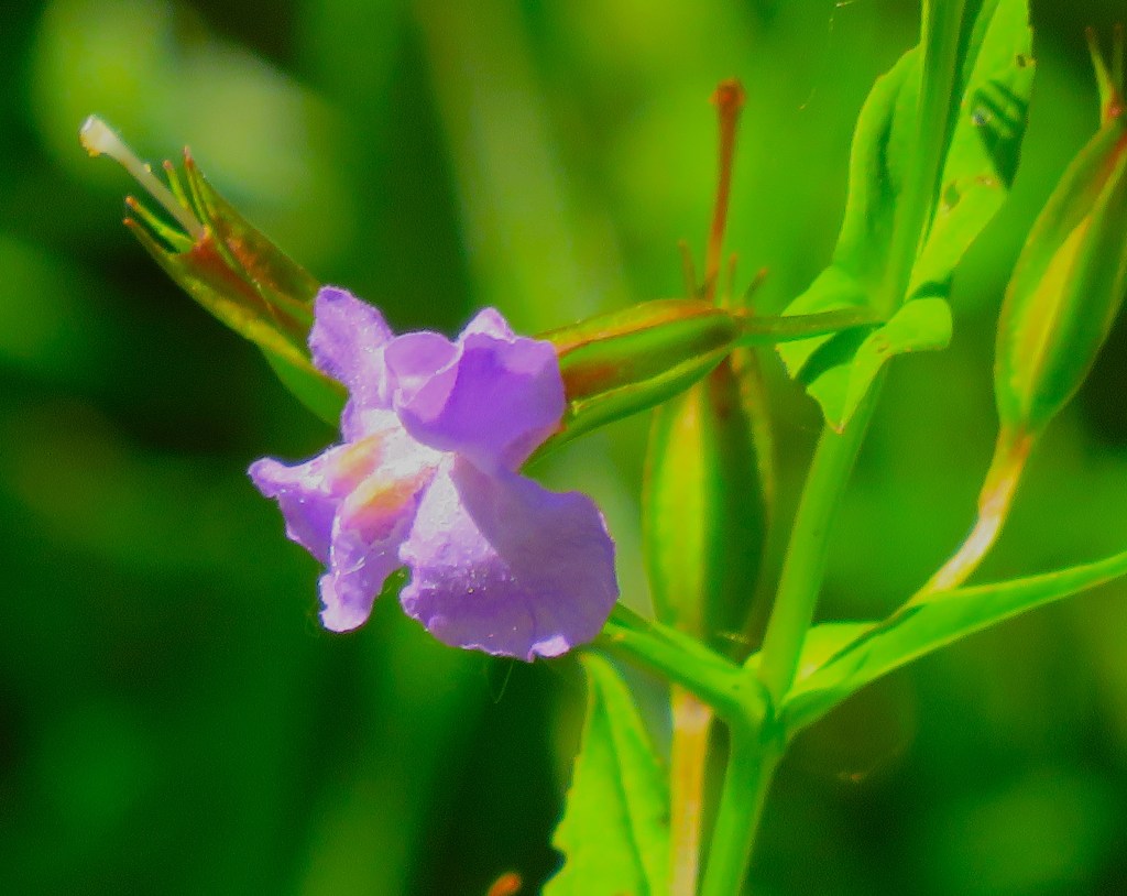 Driving home from Buffalo River on Highway 32 north, we pass several wildlife management areas abundant with cattails and ponds. One of my favorite birds, the unmistakable Belted Kingfisher, Megaceryle alcyon, perches on a power line. We stop at Heiberg Park in Twin Valley to check out a bridge that crosses Mashaug Creek. I see another new flower, purple and large, with wavy petals. Behind each petal is a cylindrical, balloon-like tube. The shape of the plant resembles the shape of Bladder Campion, Silene vulgaris, an invasive plant we often see in Polk County. I’ve discovered Allegheny Monkey Flower, Mimulus ringens, a flower described by Minnesota Wildflowers as unlike anything else in Minnesota.