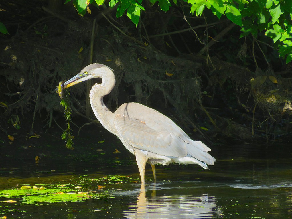 Great Blue Heron, Ardea herodias, fishing for Bullheads, Ameiurus. Sertoma Park, Grand Forks, ND. Photo by Danielle, August 2025.