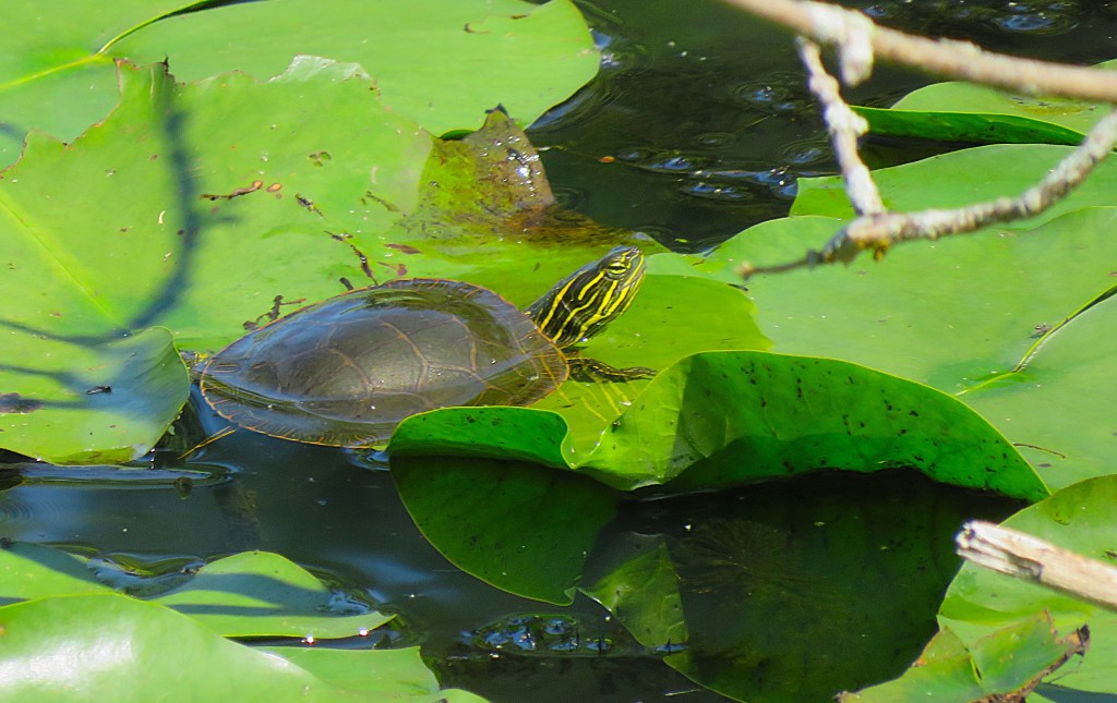 I daydream of Claude Monet’s water lilies. Monet painted flowers from his own garden, on his property in Giverny, France. I wonder if he sensed the French Fries I see at the heart of the water lilies. One thing I love about Monet is how his work captures the multihued palette of subtle variations in color that enliven aesthetic, natural places. Looking out at the ponds of the Mine site, I see fantastical greens: the chartreuse shade of the lily pads, the pear tint of the Yellow Pond-Lily’s stem. One by one, we count Painted Turtles, Chrysemys picta. Close-up, their skin patterns look like inked line drawings, colored with alcohol markers in stripes of cadmium green and habanero. I imagine writing a short story about a person hired to name the colors of markers and crayons. For Monet, the water lilies transcended mere subject matter. They shaped Monet as an artist, with the floating flowers anchoring dreamy, moody paintings that busied him for decades.